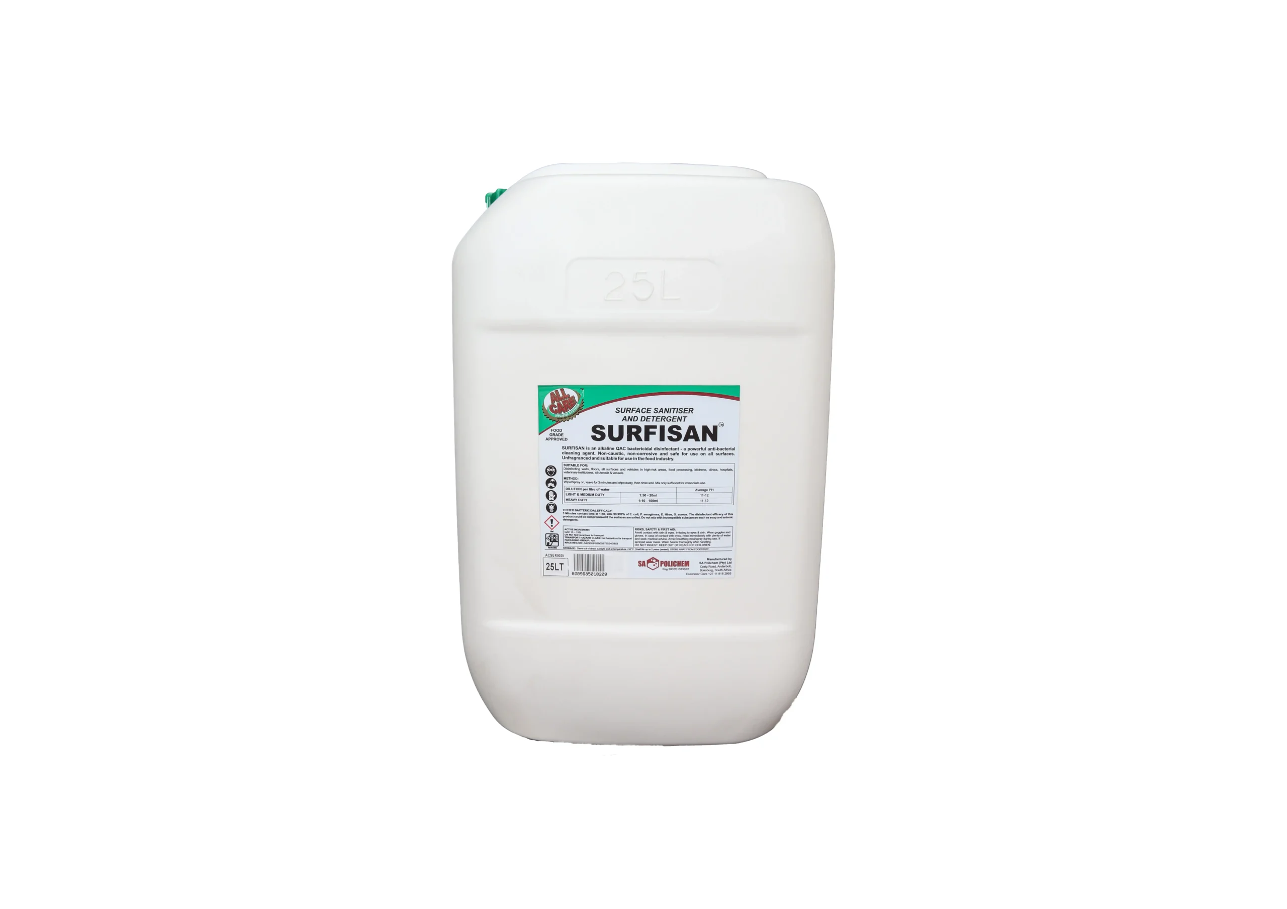 Surfisan is an alkaline QAC Bactericidal disinfectant surface sanitiser and a powerful antibacterial cleaning agent. Non-caustic, non- corrosive and completely safe to use on all surfaces. Unfragranced, suitable for use in the food industry. Disinfecting walls, floors, all surfaces and vehicles in high-risk areas, food processing, kitchens, clinics, hospitals, veterinary institutions, all utensils & vessels. Tested Bactericidal Efficacy: 5 Minutes contact time at 1:100, Kills 99.999% of E. coli, P. aeruginosa, E. Hirae, and S. aureus. NRCS Registration: NRCS Registration: NRCS/8054/295890/657.